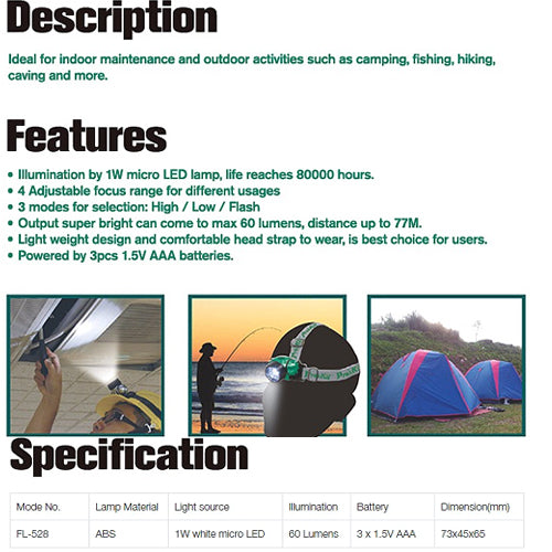ProsKit FL-528 1W LED Adjustable Head Light Meter Head Mounted Torch Light